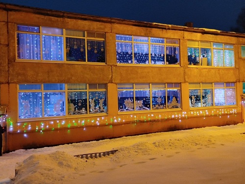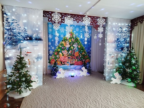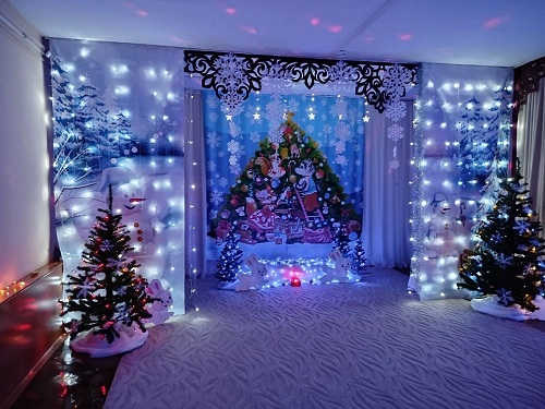 В детском саду №1. "Теремок" наступающий праздник Нового года чувствуется начиная с территории. Все украшено разноцветными гирляндами, яркими огнями и самодельными фигурами. Внутри каждый уголок дошкольного учреждения оформлен в новогодней тематике, как будто в сказке! Музыкальный зал готов к проведению праздничных мероприятий: сверкает огнями красавица елка, яркие новогодние баннеры, украшенные множеством гирлянд создают атмосферу праздника, новогоднего настроения.Мы стараемся окунуть наших воспитанников в мир волшебства и удивительной сказки, надеемся, что нам это удается!