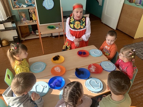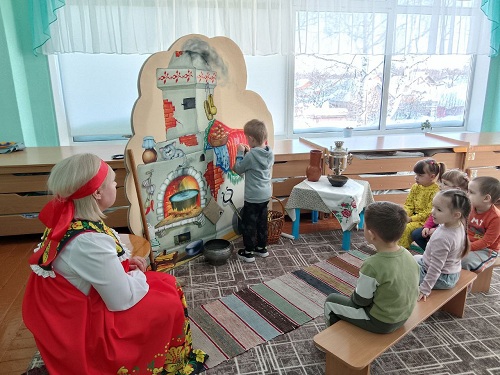 В рамках участия в инновационной площадке федерального уровня "Патриотическое воспитание в социокультурной среде ДОО" воспитанники МБДОУ "Детский сад 1"Теремок" совершили увлекательное путешествие в прошлое. Дети познакомились с главным элементом русской избы - печкой, которую ласково называли "матушкой",исконно русскими предметами утвари: чугуном, ухватом, самоваром. Кроме того, ребята попробовали сделать одежду из шерсти, а это оказалось не столь простым делом. В завершении путешествия дошколята поиграли в народную игру и станцевали русский танец. Такие путешествия позволяют детям глубже узнать историю России, прикоснуться к духовному наследию прошлого.
